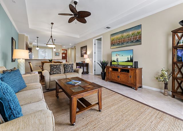 Our unit is across from the Queens’ Market Place shopping village and has views of the golf course & lake.