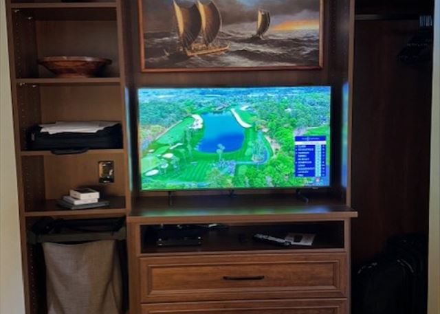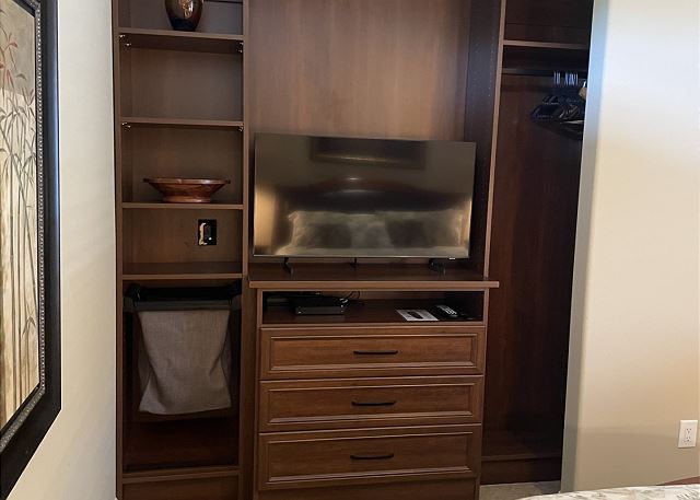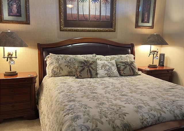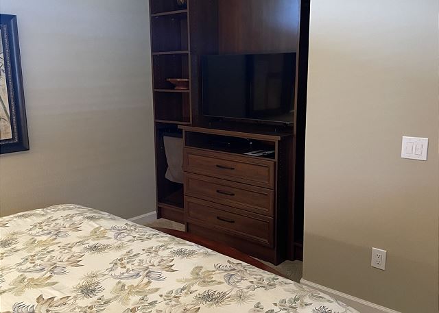 The secondary bedroom is elegantly appointed with a king size bed with beautiful end tables, plush mattress with 400 thread count Egyptian cotton linens, NEW custom closet built-in with Samsung 43″ flat screen smart tv.