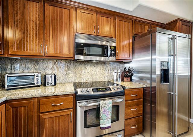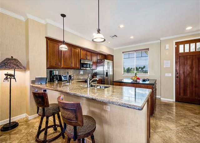 The large gourmet kitchen is almost twice the size of standard, and nicely appointed with stainless steel appliances, granite counters, large island, wine cooler, comfortable counter seating for entertaining guests, etc.