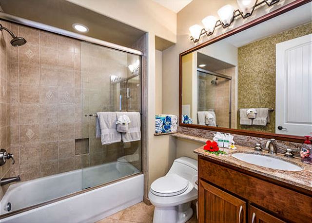 The 2nd bathroom is nicely appointed with a shower & bath combination, elegant marble counter, and plush over sized towels.