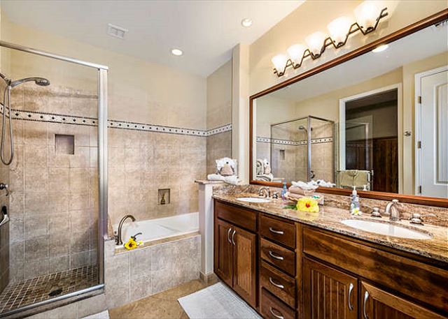 The large en-suite master bath is luxuriously appointed with a large vanity with double sinks and elegant marble counter, large romantic soaking tub, plush over sized towels, and adjoining walk in closet.